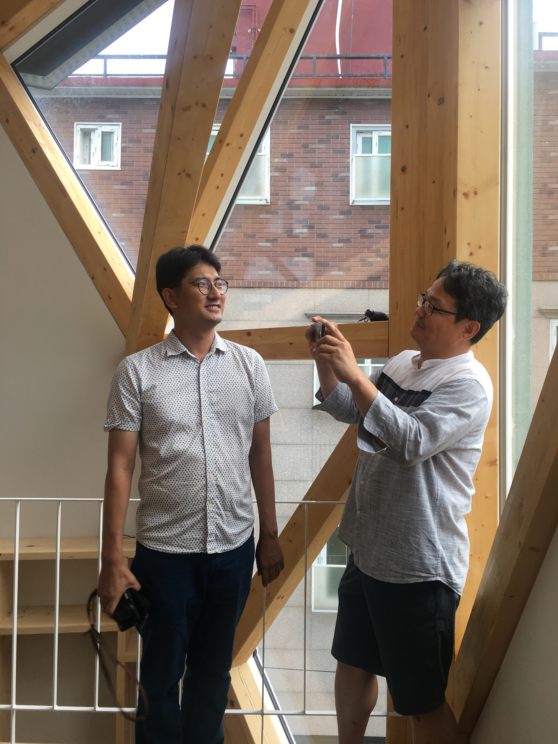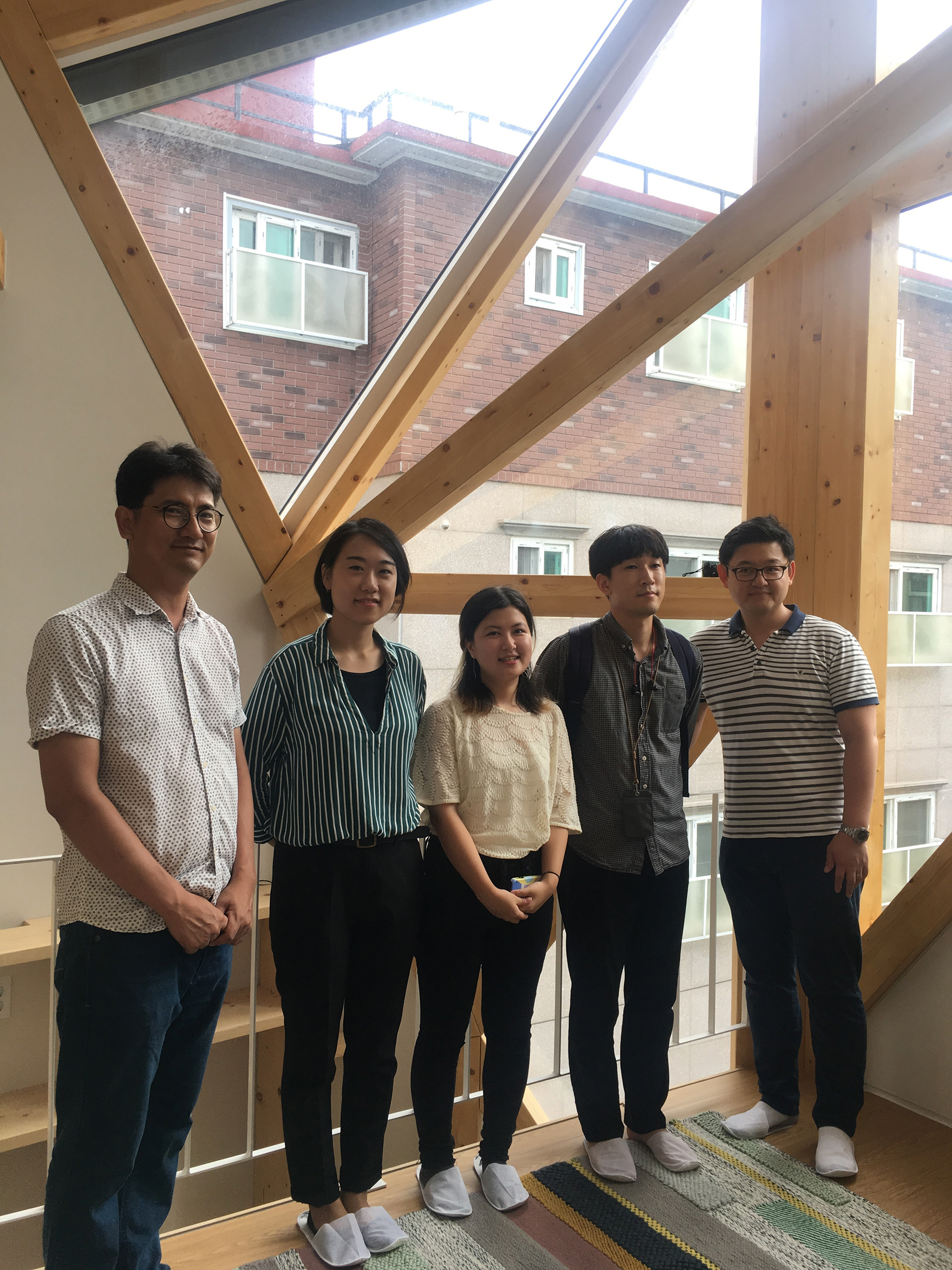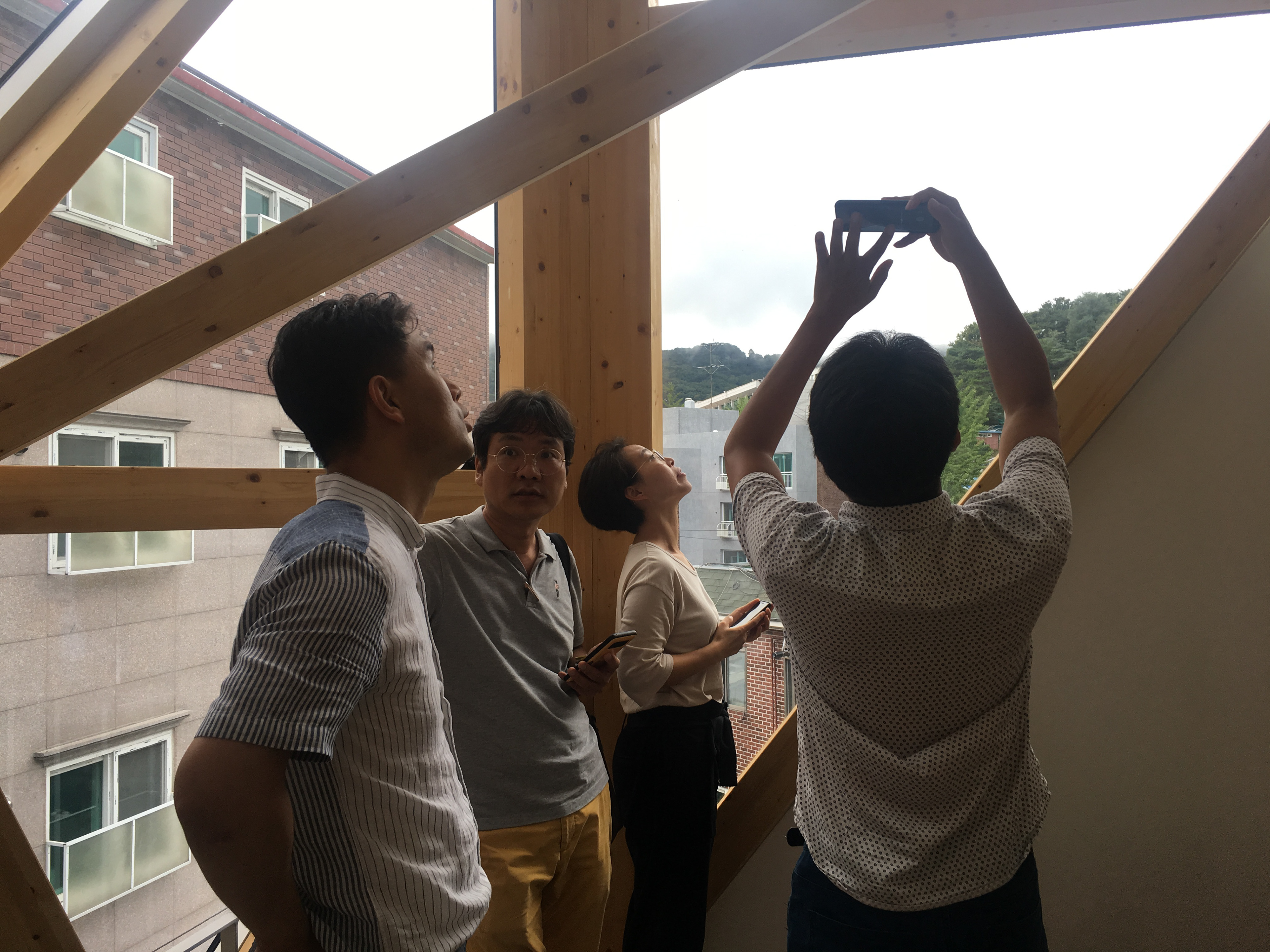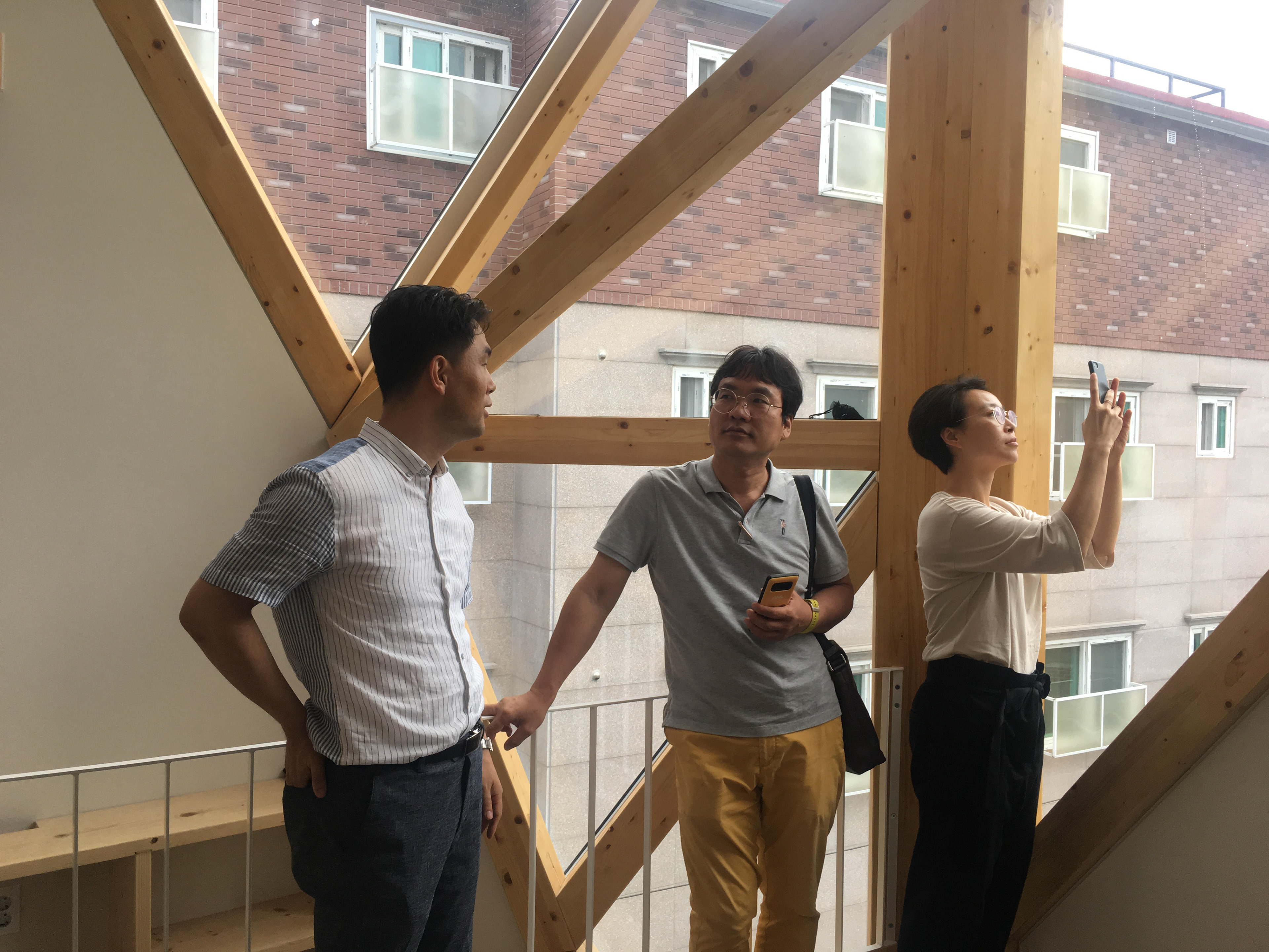 경사면에 위치해 있어 1층은 콘크리트 구조로 계획하였고 그 위에 두 개 층의 목구조가 얹어졌다. 목구조는 중목구조를 이용하였고 마치 신발끈을 묶듯 얼기설기 얽힌 구조를 만들어 자연스럽게 구조가 내부에 드러나도록 하였다.