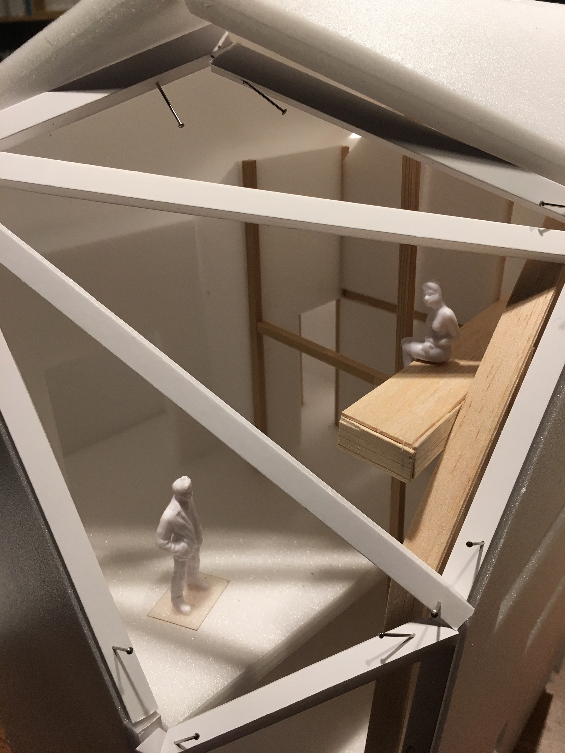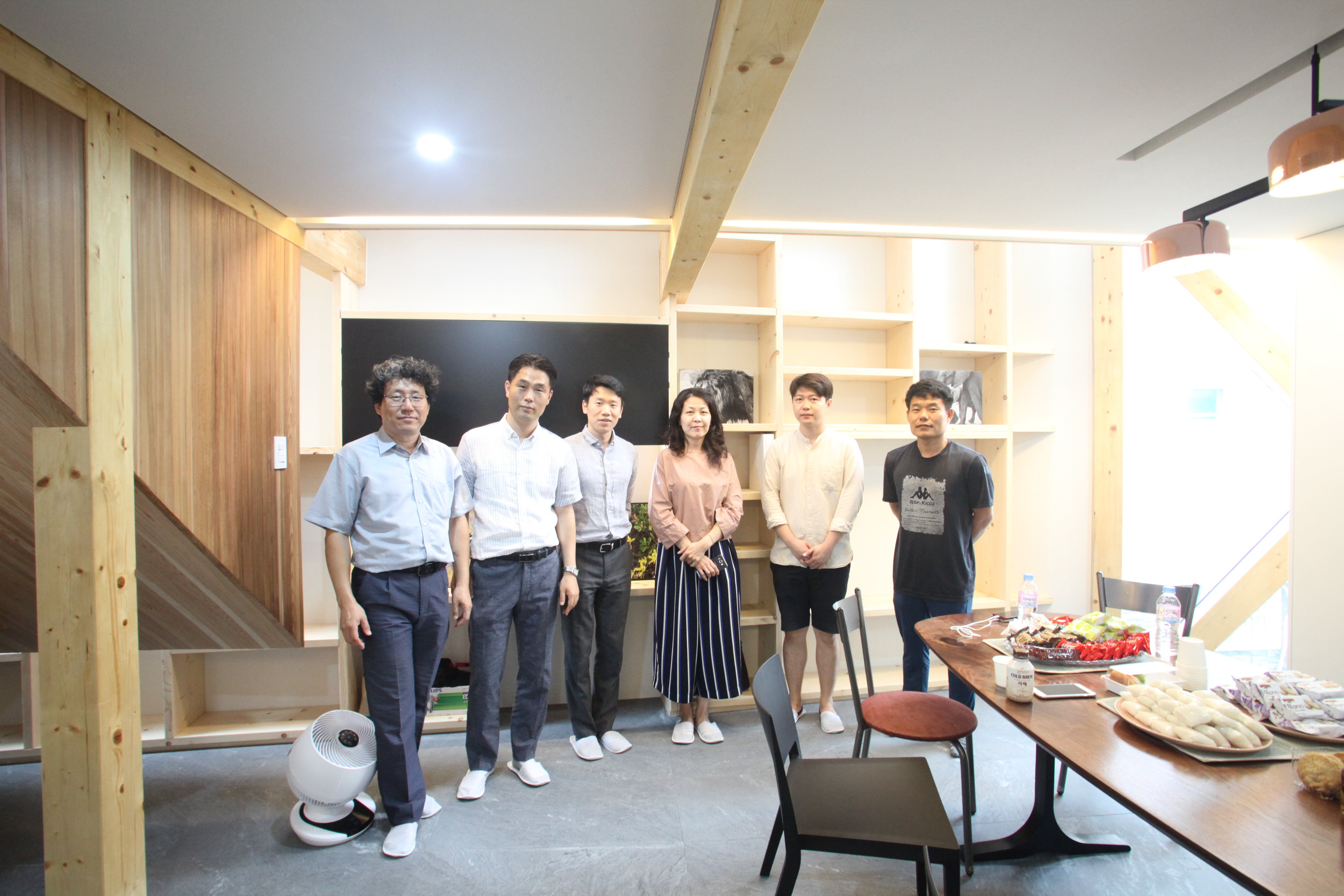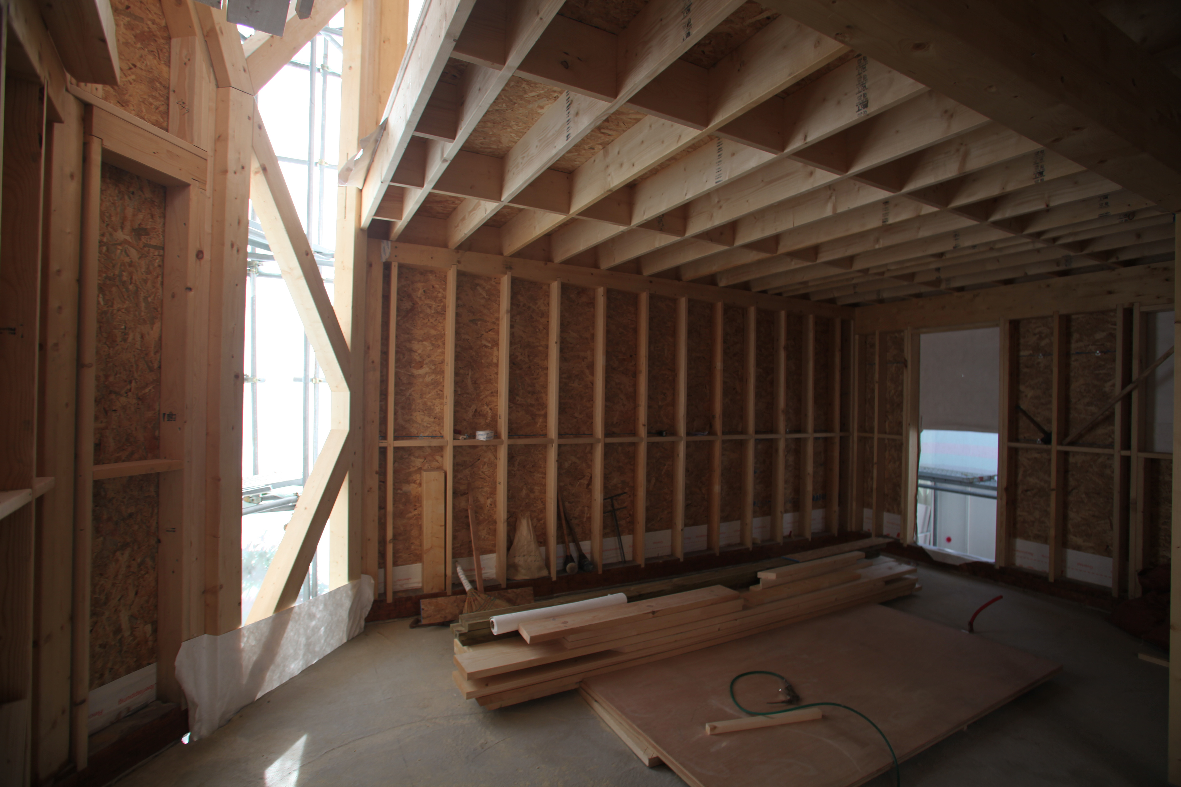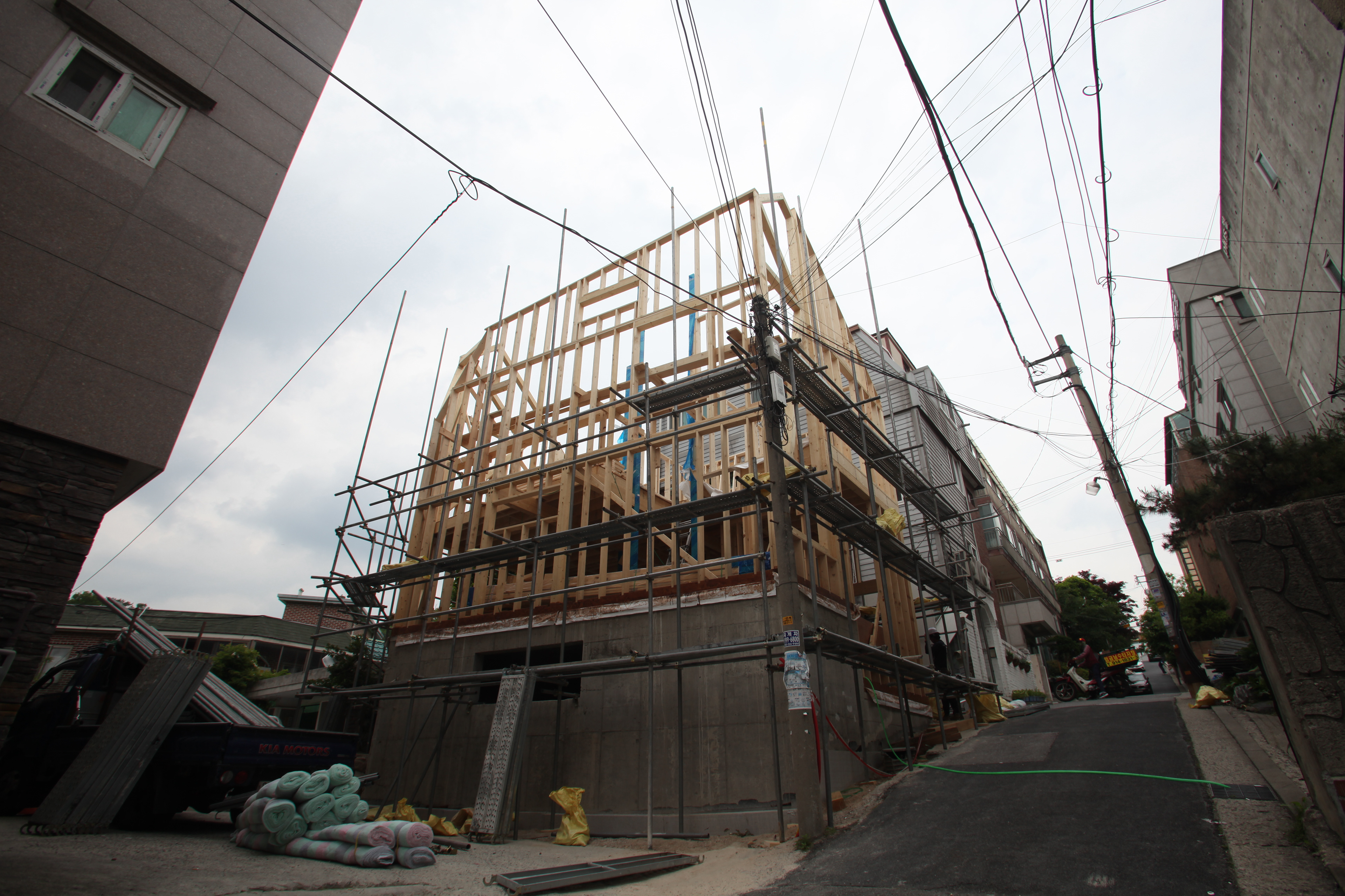 경사면에 위치해 있어 1층은 콘크리트 구조로 계획하였고 그 위에 두 개 층의 목구조가 얹어졌다. 목구조는 중목구조를 이용하였고 마치 신발끈을 묶듯 얼기설기 얽힌 구조를 만들어 자연스럽게 구조가 내부에 드러나도록 하였다.
