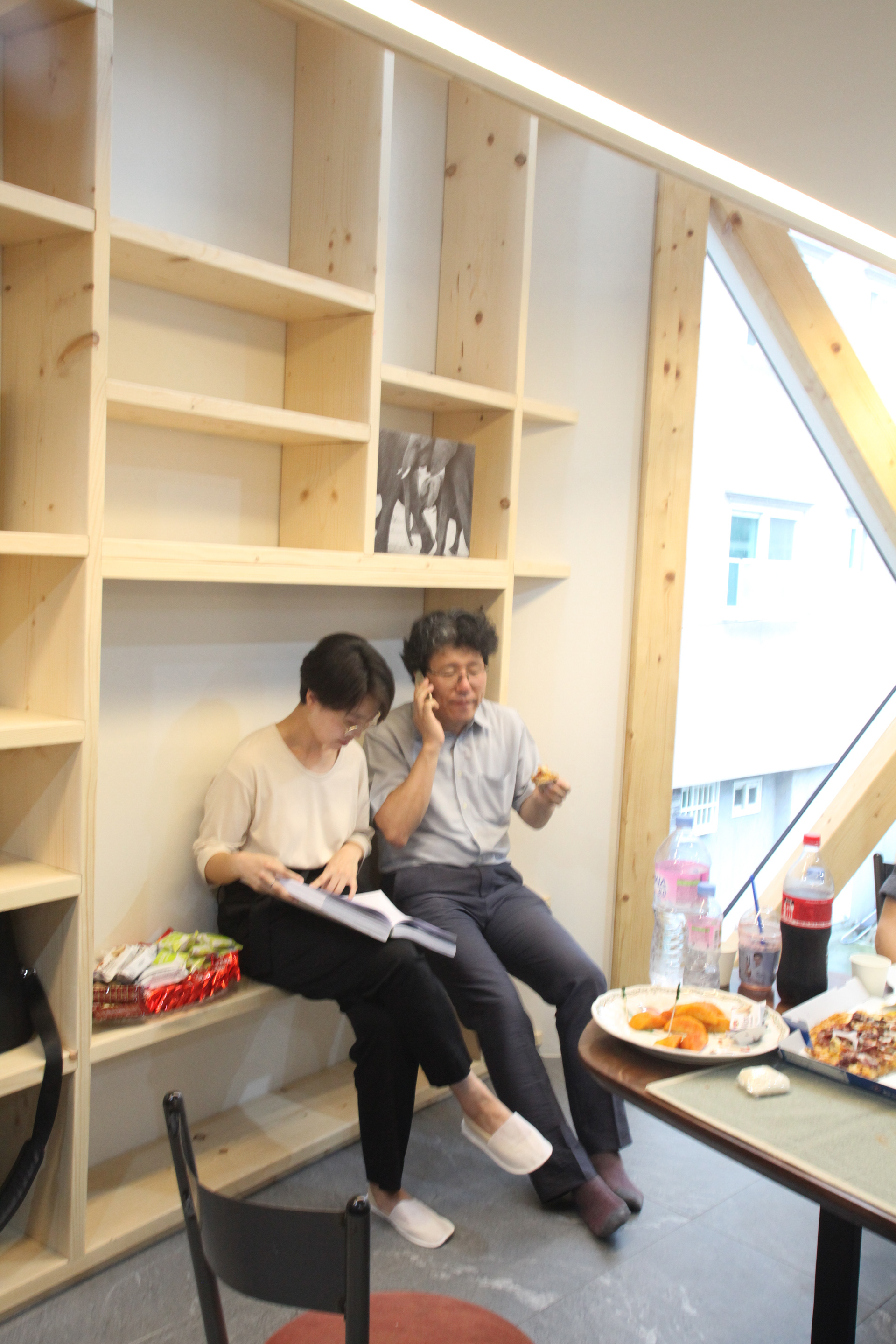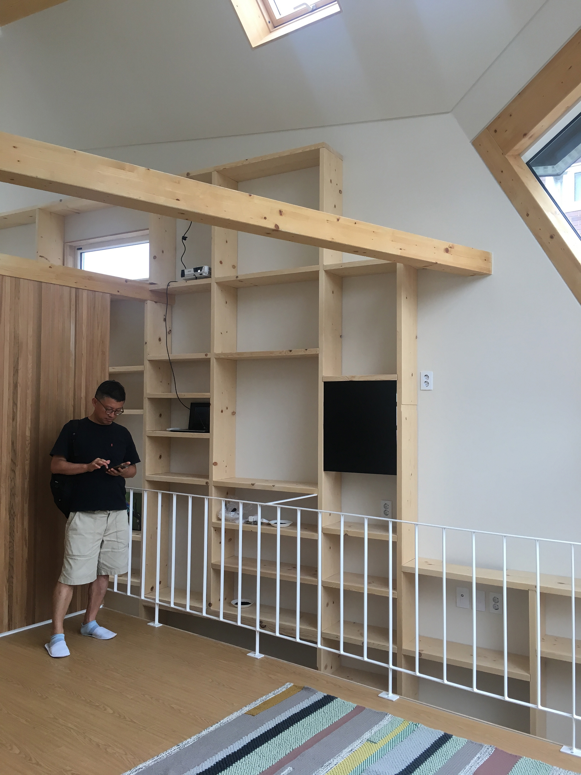 작은 집에서의 수납은 현관주변의 공간을 집중적으로 공략했다. 현관에는 신발장을 시작으로 1층의 보일러와 전기 분배기, 욕실까지 이어지는 공간이 모두 수납장이다. 2층도 마찬가지로 보일러를 포함한 크고 작은 수납공간들이 계단참의 바닥 수납공간까지 이어진다. 이어지는 책꽂이 형태의 ‘가족서가(家族書架)’는 2층의 거실에서 3층의 안방을 지나 다락까지 이어진다. 서가의 끝은 건축주의 작업실이다. 2,3층의 공간은 남쪽 가족서가의 틈을 따라 서로 연결되어 있다. 결국 안방과 거실, 주방은 하나의 공간으로 연결된 것인데 3층에 위치한 딸의 방은 마치 커다란 원룸에 속해있는 작은 우주와 같다. 작은 방이 두 개의 다락과 1개의 옷장, 그리고 하나의 침대로 구분되어있어 기차의 침대칸처럼 보인다.